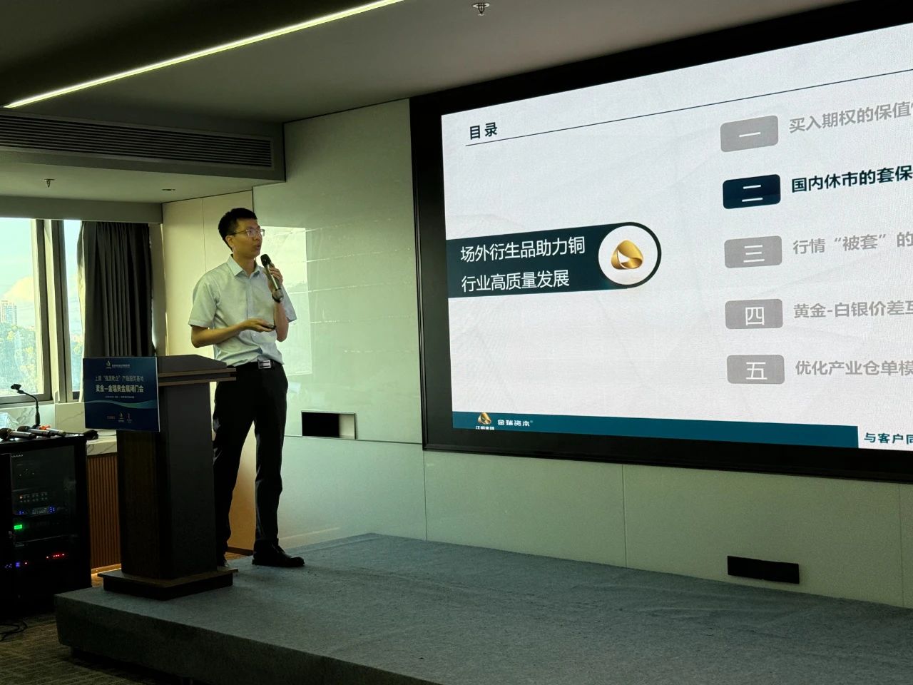 金瑞资本营销与产品部负责人翁展图介绍贵金属风险管理子公司价值及场外衍生品工具:买入平值看涨期权可替代期货保值,避免追保并放大利润;贵金属场外远期用于休市锁价,降低波动风险;熔断末日累沽期权解“被套”困境;黄金-白银跨品种价差互换利用相关性套利,降低保证金压力;优化产业仓单含权模式,融合期权与仓单业务实现降本增效,助力企业应对波动、提升竞争力。