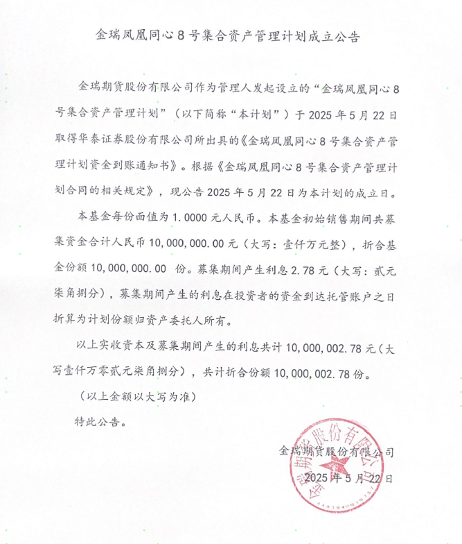 金瑞凤凰同心8号集合资产管理计划成立公告