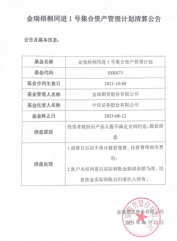 金瑞梧桐同进1号集合资产管理计划清算公告
