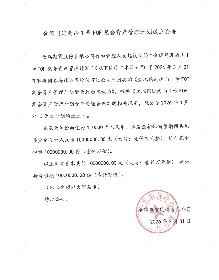 金瑞同进南山1号FOF集合资产管理计划成立公告